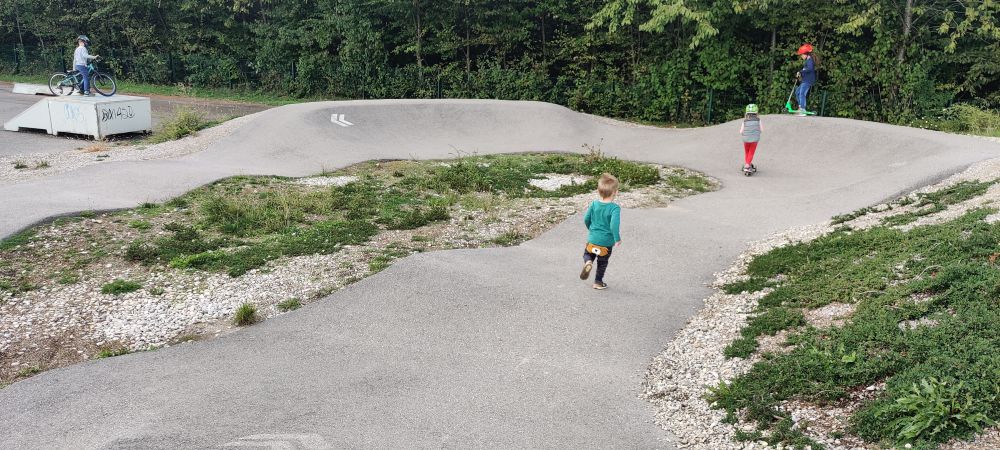 Der Kleine mit seinen 2 Jahren wollte nicht mit dem Laufrad fahren aber dafür durch den Anfänger Pumptrack rennen. Er hat sich eingereiht und war dann auf zwei Beinen statt auf zwei Rändern unterwegs 🙂 Zudem war es für ihn ein riesen Abenteuer den großen Pumptrack im Gelände zu umrunden.