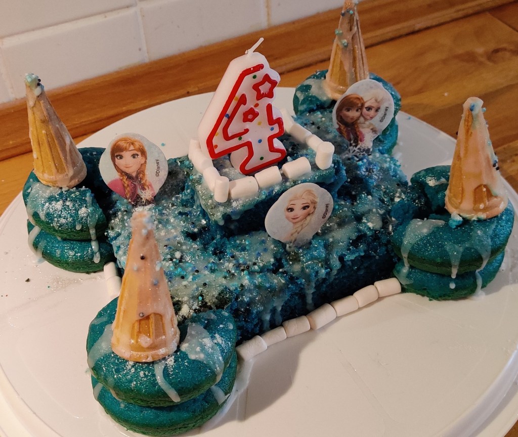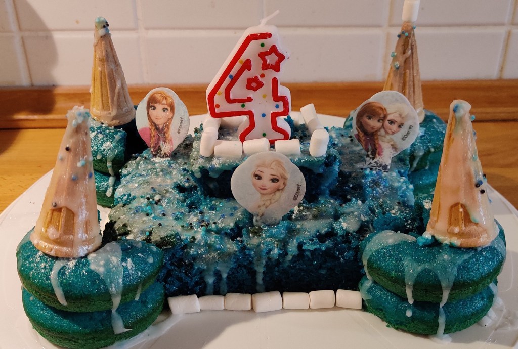 Es gab einen leckeren blau eingefärbten Marmorkuchen und Donots – diesmal als Eisschloss dekoriert mit Esspapier-Figuren. Das Schloss in der Mitte ist geschnitten aus einem Kastenkuchen, die vier seitlichen Türme sind mit je zwei Donots und kleinen Waffeln gebaut. Mit Zuckerguss, blau/weißen Zuckerstreusel, Mini-Marshmallows und Glitzerpulver habe ich das Schloss dekoriert.