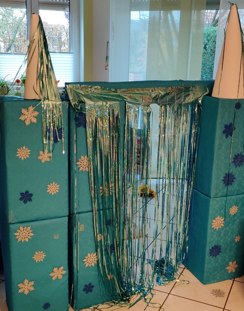 Im Wohnzimmer habe ich aus den Kartons, die ich von der Minecraft-Party noch habe, ein kleines Eisschloss gebaut. Die Kartons habe ich mit turkiser Tischdeckenfolie (Baumarkt) eingepackt. Aus weißen DIN-A3 Tonpapier habe ich die Turmspitzen geformt. Bei Amazon habe ich einen Glitzervorhang und die glitzernden Schneeflocken besorgt.