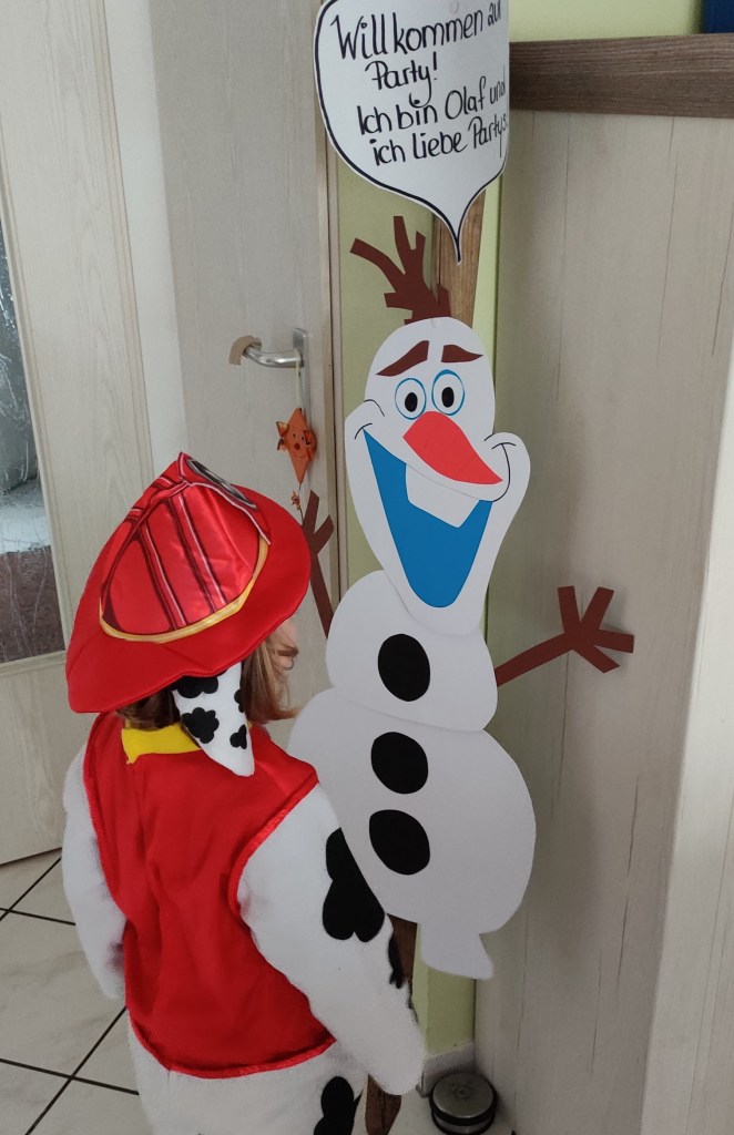 An der Haustüre hat Olaf unsere Gäste begrüßt! Gebastelt haben wir ihn aus Tonpapier und an einer Zaunstange mit Reiszwecken befestigt.