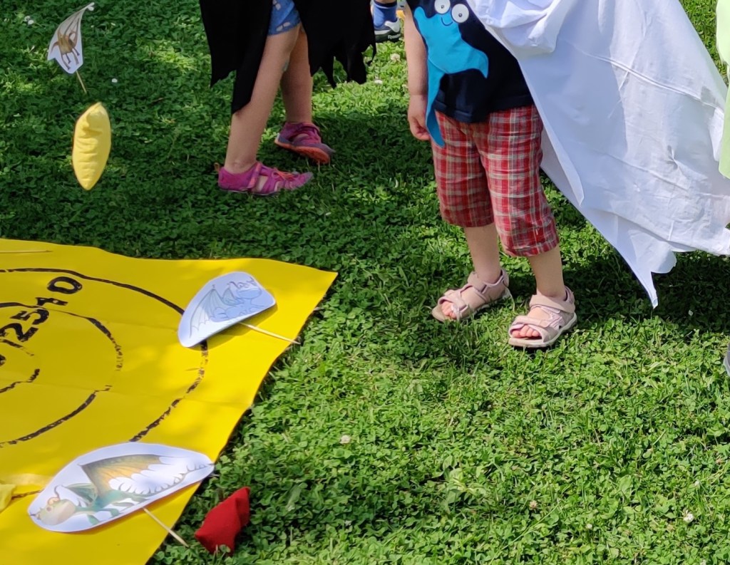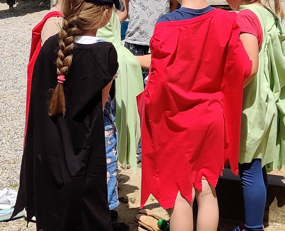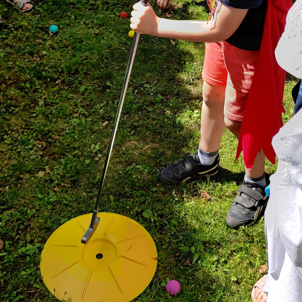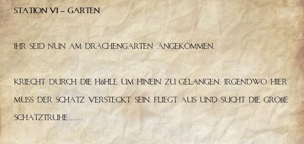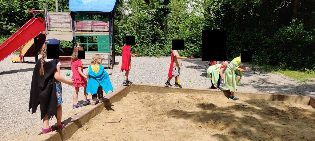 Station 6 – Drachengarten: Im Drachengarten angekommen mussten die Kinder sich an den Drachen vorbei „kämpfen“, um zur Schatztruhe zu kommen. Das erste Spiel war mit Wurfsäckchen die Drachen abzuwerfen. Im zweiten Spiel hatten sich Drachen zwischen und hinter den Kegeln versteckt, die umgeworfen werden mussten. Den Abschluss bildete das Minigolf, bei dem die Kinder die Ball um die Drachen herum in ein Loch schlagen mussten. Die Schatztruhe befand sich am Ende des Minigolfspiels und wurde mit großer Freude geplündert.