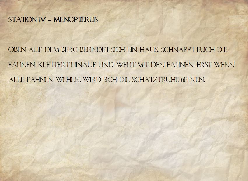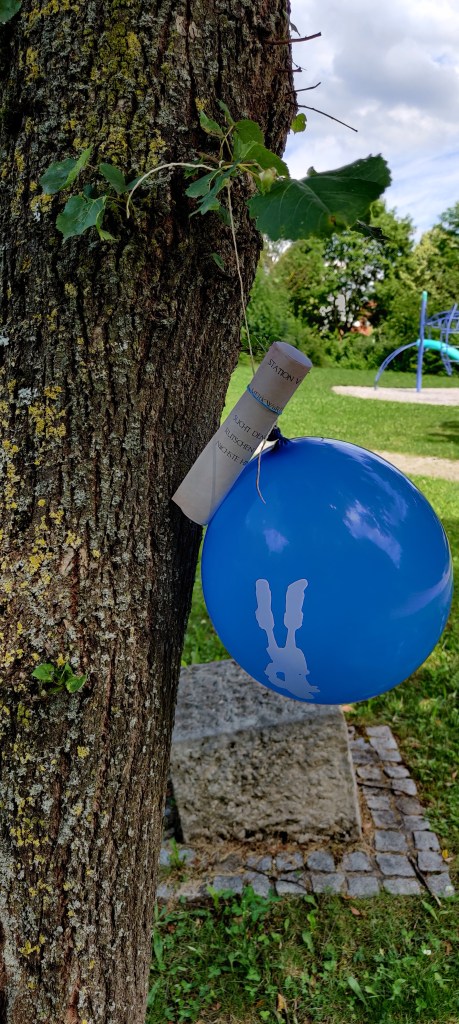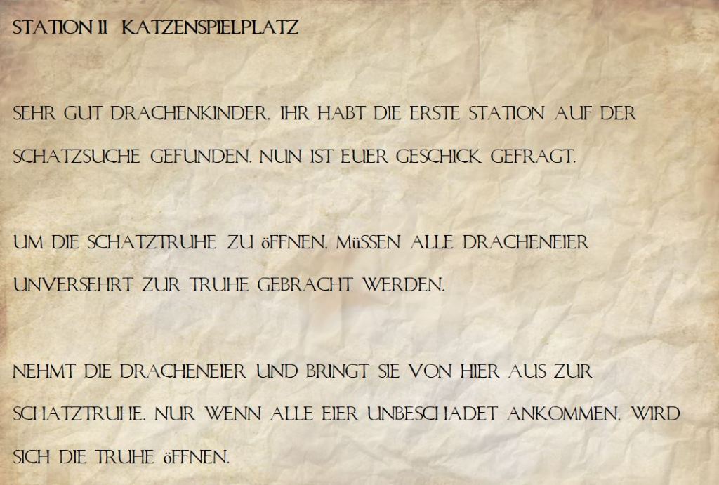 An jeder Station war ein Luftballon hinterlegt mit Anweisungen, was hier zu tun ist, sowie einer Schatzkiste mit einer Hinweiskarte, wie die Suche weitergeht.