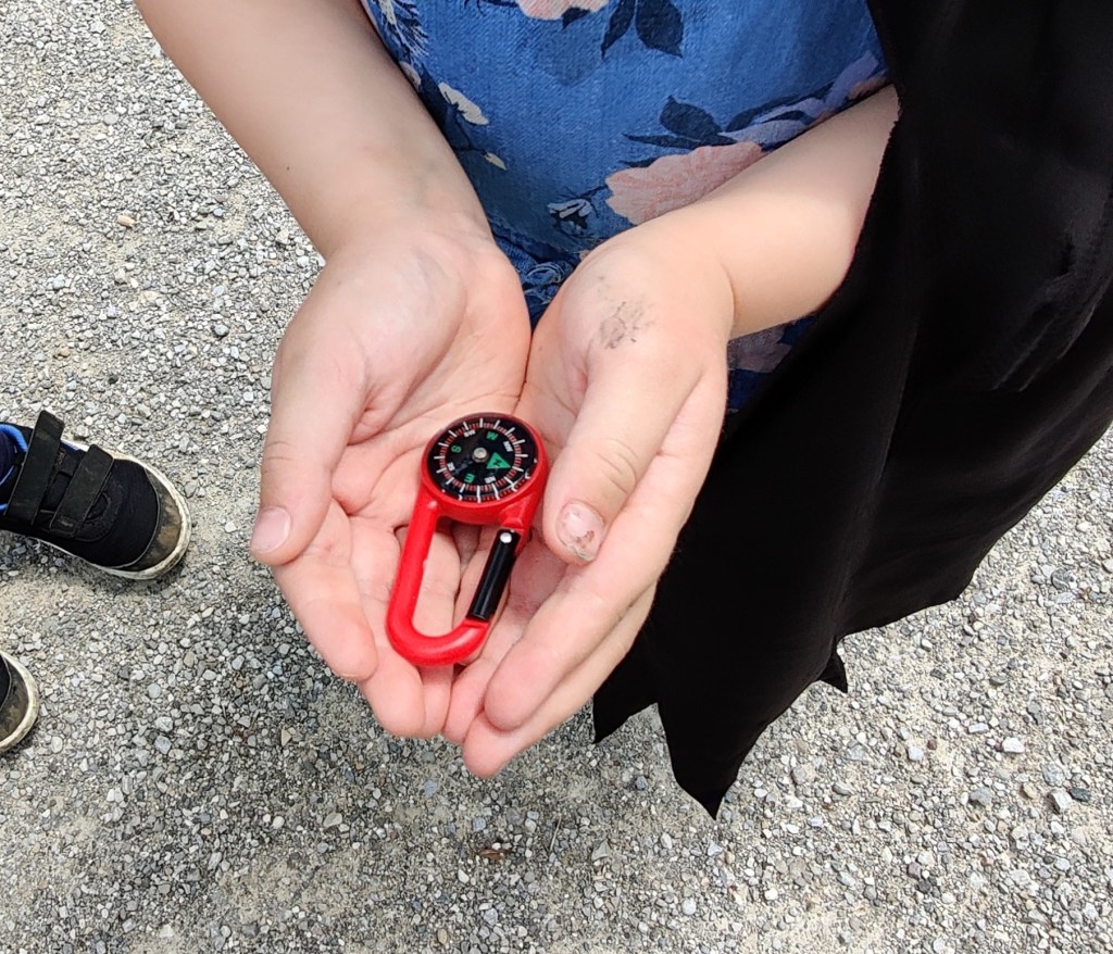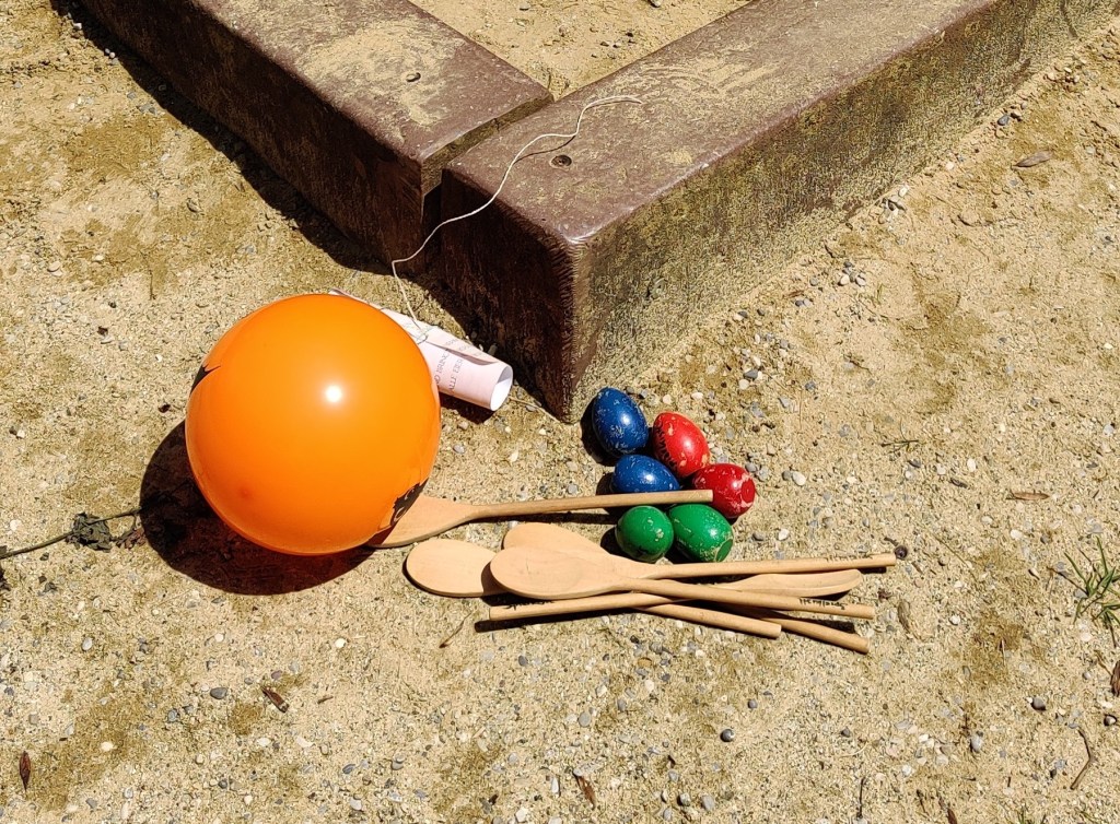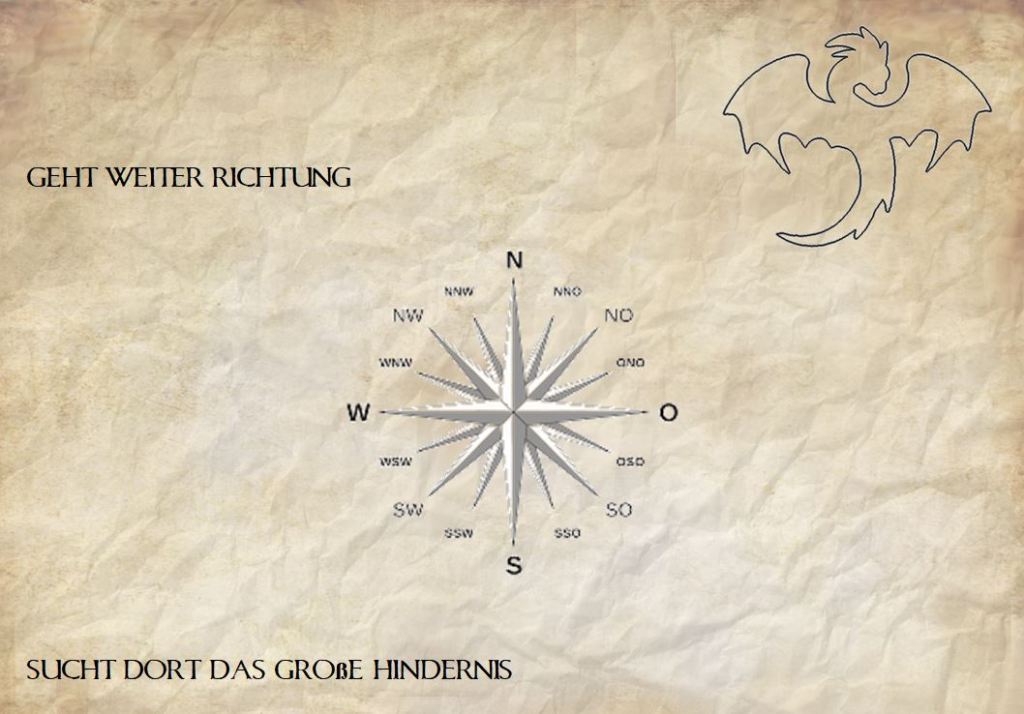 Station 2 – Dracheneier: Am Spielplatz war die Anweisung hinterlegt, dass die Dracheneier sicher auf die andere Seite zur Truhe gebracht werden müssen. Mit Holzlöffeln und Holzeiern balancierten die Drachenkinder auf der Sandkastenumrundung zur Truhe. In der Truhe fanden Sie für jeden einen kleinen Kompass und die Anweisung in Richtung Norden weiter zu ziehen.