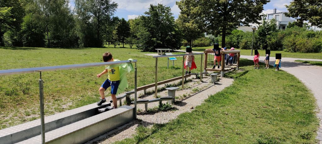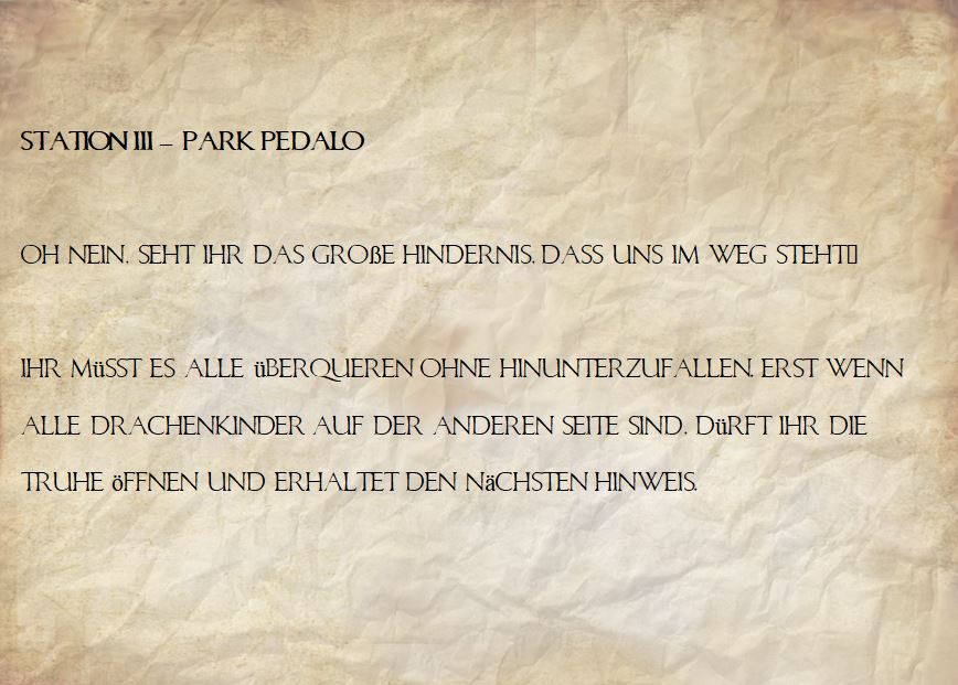 Station 3 – Geschick zeigen: Zunächst über Wege und dann über die große Wiese ging es zur nächsten Station. Im Park steht ein Pedalo mit verschiedenen Balaciermöglichkeiten. Diese mussten alle Kinder überqueren, um am anderen Ende die Schatztruhe mit dem nächsten Hinweis zu finden.