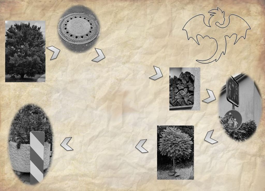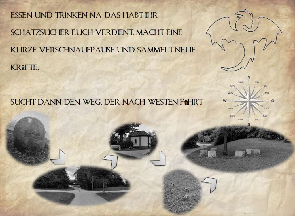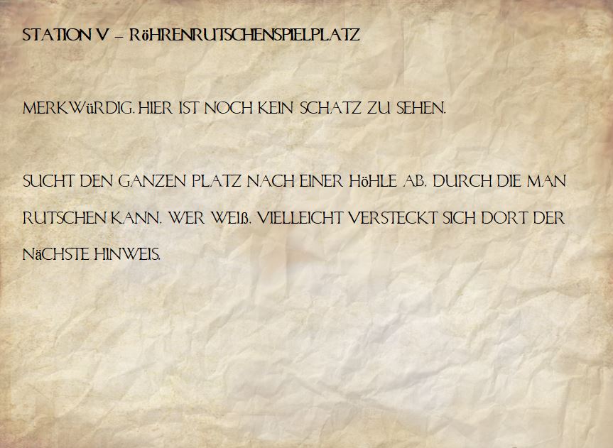 Station 5 – Bergab: Weiter geht die Wegessuche wieder entlang von bildlich dargestellten Wegmarken. Der Weg führt zu einem Spielplatz, an dem eine Röhrenrutsche ist. An dessen Ende befindet sich der nächste Hinweis.