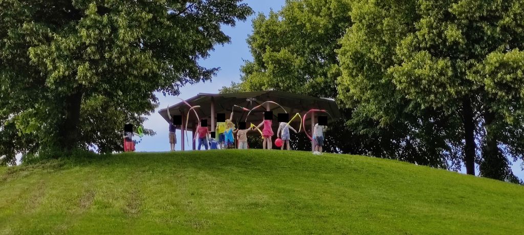 Station 4 – Lasst die Fahnen wehen: Der Berg ist unweit des Pedalos. Die Kinder fanden neben der Aufgabe auch Gymnastikbänder, die sie den Berg mit hoch genommen haben und dort mit ihren Fahnen wehen mussten. In der Schatztruhe war Verpflegung, die wir bei einer kleinen Picknickpause verzehrt haben.