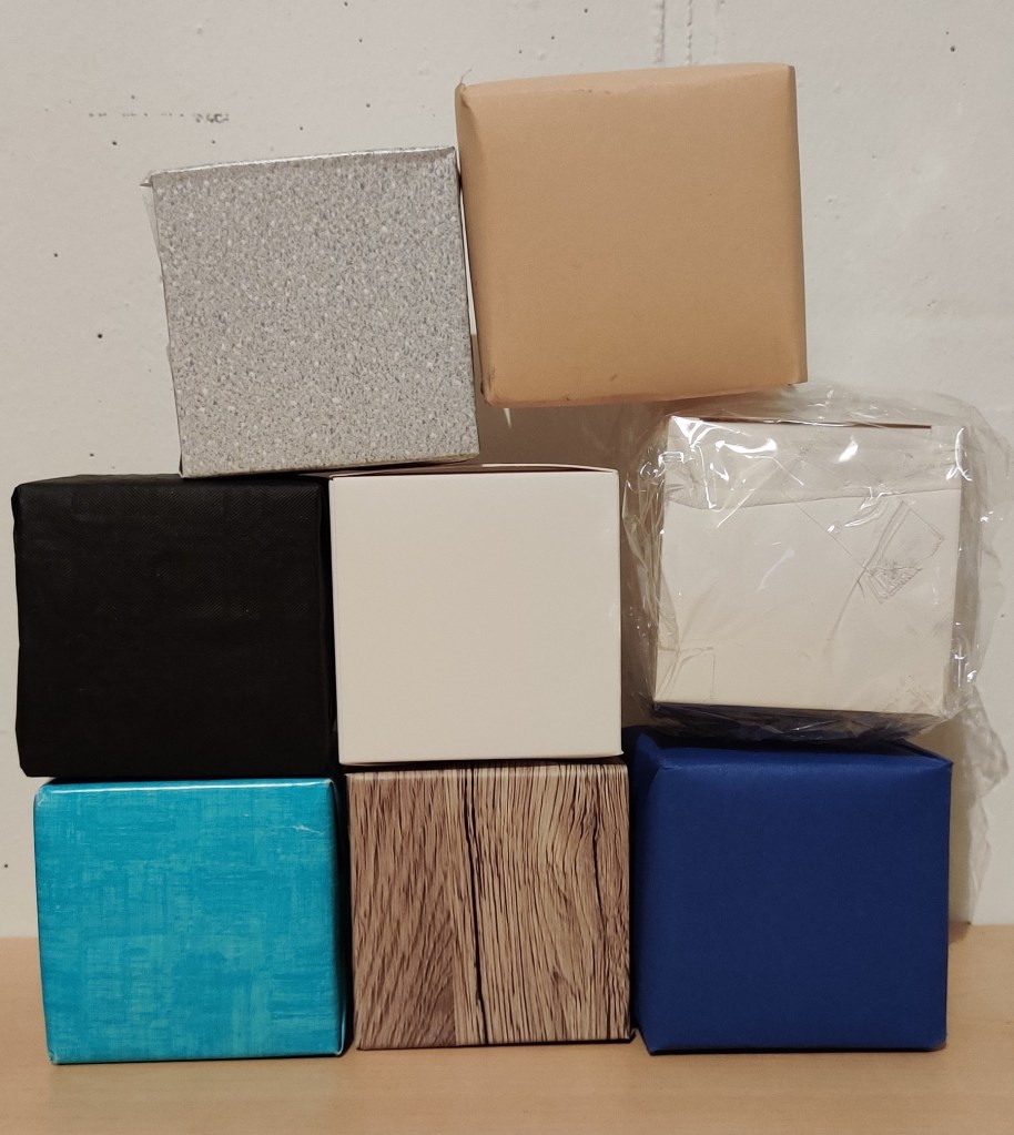 Ich habe quadratische Kartons in drei Größen 8×8, 15×15 und 30×30 besorgt aber auch große Kartons aus dem Keller verwendet. Die großen Kartons bildeten Grundlage für die Figuren oder die Standardblöcke. Die mittleren Kartons wurden zu Eisenblöcken für unsere erste Station und für den Enderdragon. Die kleinen Blöcke waren die Erze und Materialien (Wasser, Holz, Sand, etc) für den Crafting-Table (großer Block mit aufgeklebten Raster).