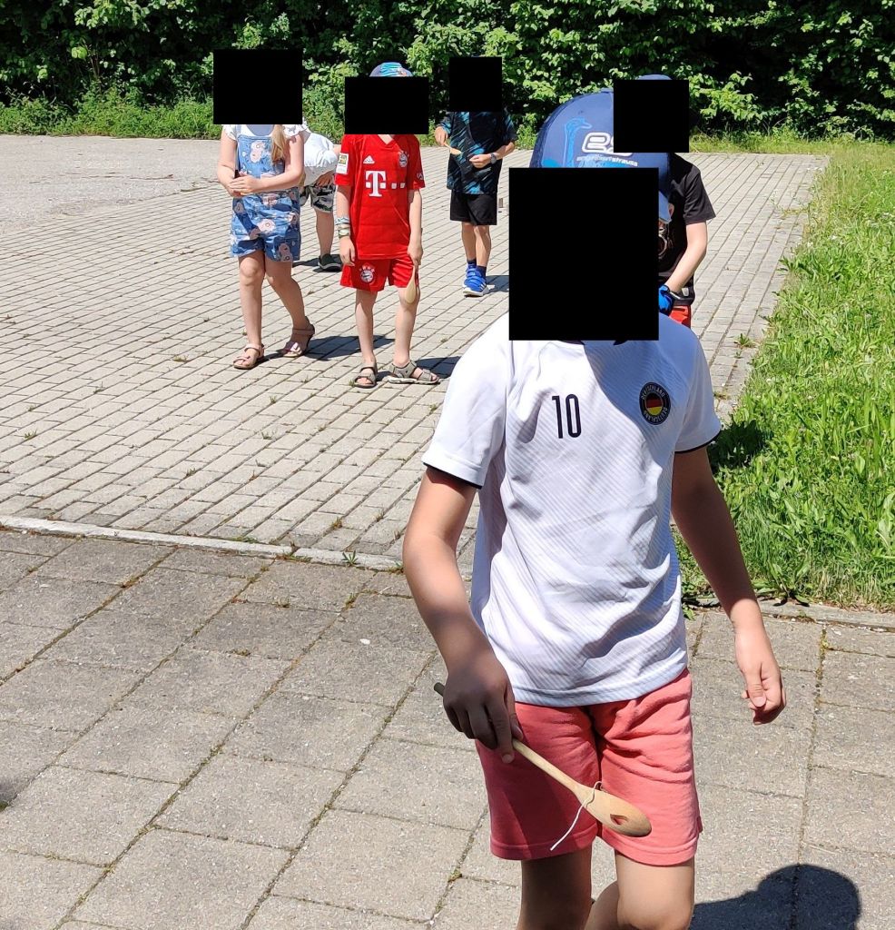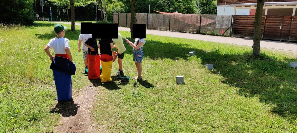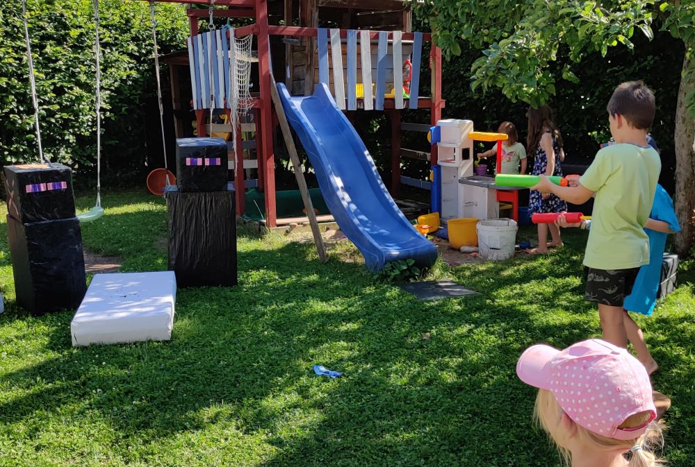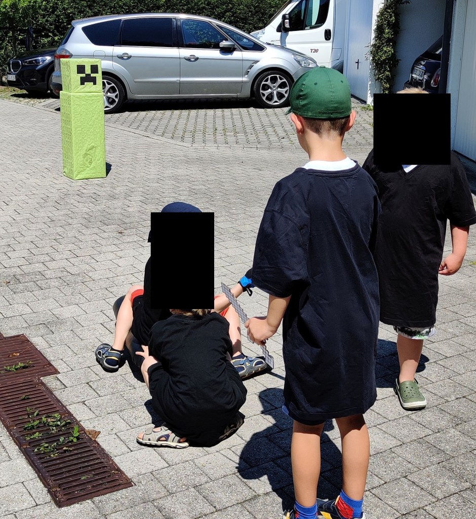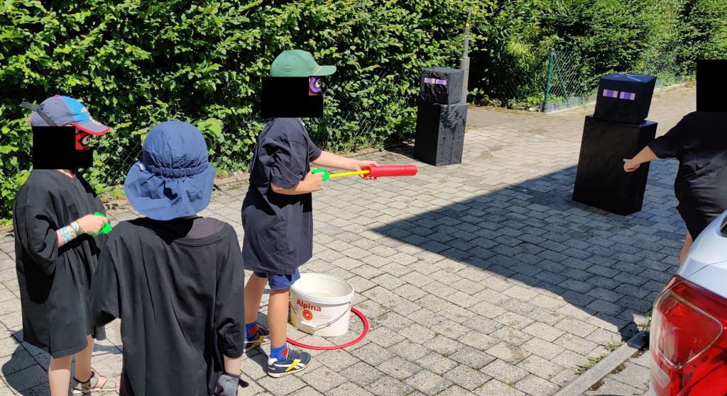 Spiel: Zwei Kinder bekommen Augenbinden. Auf der Straße habe ich Hoola-Hupp-Reifen ausgelegt. In den ersten beiden Reifen sind Wasserpistolen und im dritten ein Eimer Wasser. Dort müssen sie dann stehen bleiben und auf einen Enderman zielen. Da die zwei Abenteurer nichts sehen, müssen die anderen Kinder Kommandos geben: Zuerst die Pistole finden, dann mit Wasser aufladen und schließlich treffen. Nach jeder Runde habe ich die Kreise etwas verlegt.