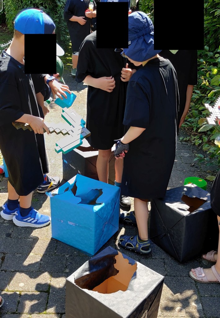 Spiel: Ein Kind setzt sich auf das Rollbrett mit dem Schwert und wird von einem anderen angeschubst. Mit dem Rollbrett müssen Sie in die Nähe vom Creeper rollen und ihn mit dem Schwert umhauen. Wir hatten zwei Creeper und zwei Rollbretter. Der Creeper droppt Schwarzpulver (kleine schwarze Blöcke). Die Kinder haben Heiltränke gecraftet (Flasche Apfelschorle für jeden) und das TNT.