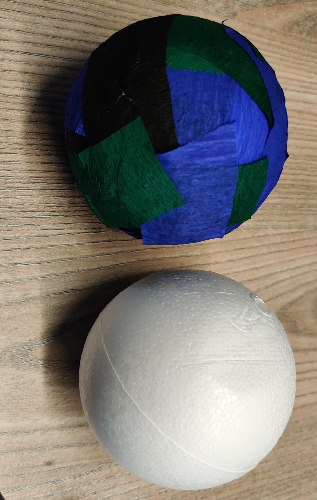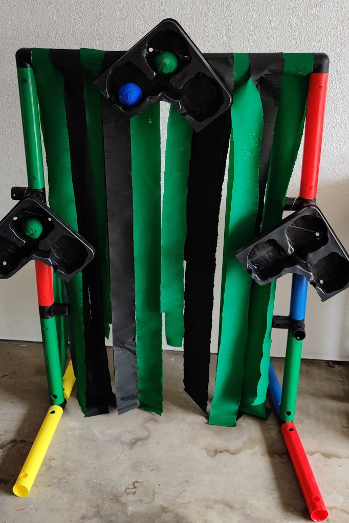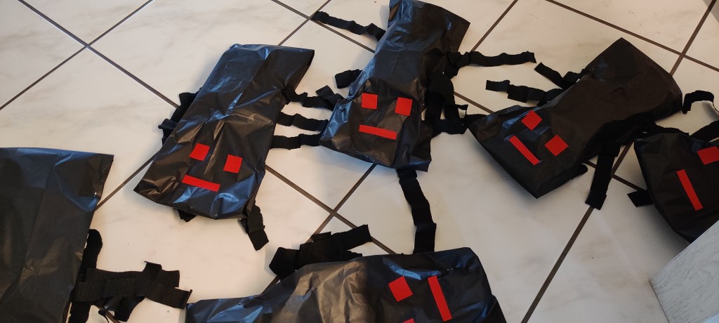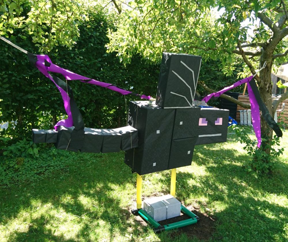 Für die Enderaugen (einfarbig je blau, grün, schwarz) und Enderpearls (mehrfarbig) habe ich Styropor-Kugeln mit Crepppapier beklebt. Das Netherportal und das Endportal habe ich mit unseren Quadro-Bausatz zusammengesteckt und mit den jeweiligen Farben (lila/schwarz bzw. grün/schwarz) mit Krepp-Papier gestaltet. Beim Endportal habe ich noch Halterungen aus zugeschnittenen Einweg-Pflanzentransportpaletten montiert, damit die Enderaugen zur Aktivierung platziert werden konnten. Die Spinnen habe ich aus schwarzen Seidenpapier gebastelt, da dies leicht mit dem Papierschwert geöffnet werden sollten.