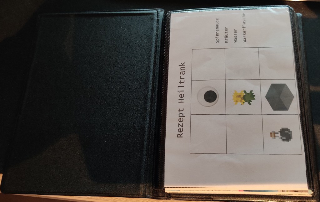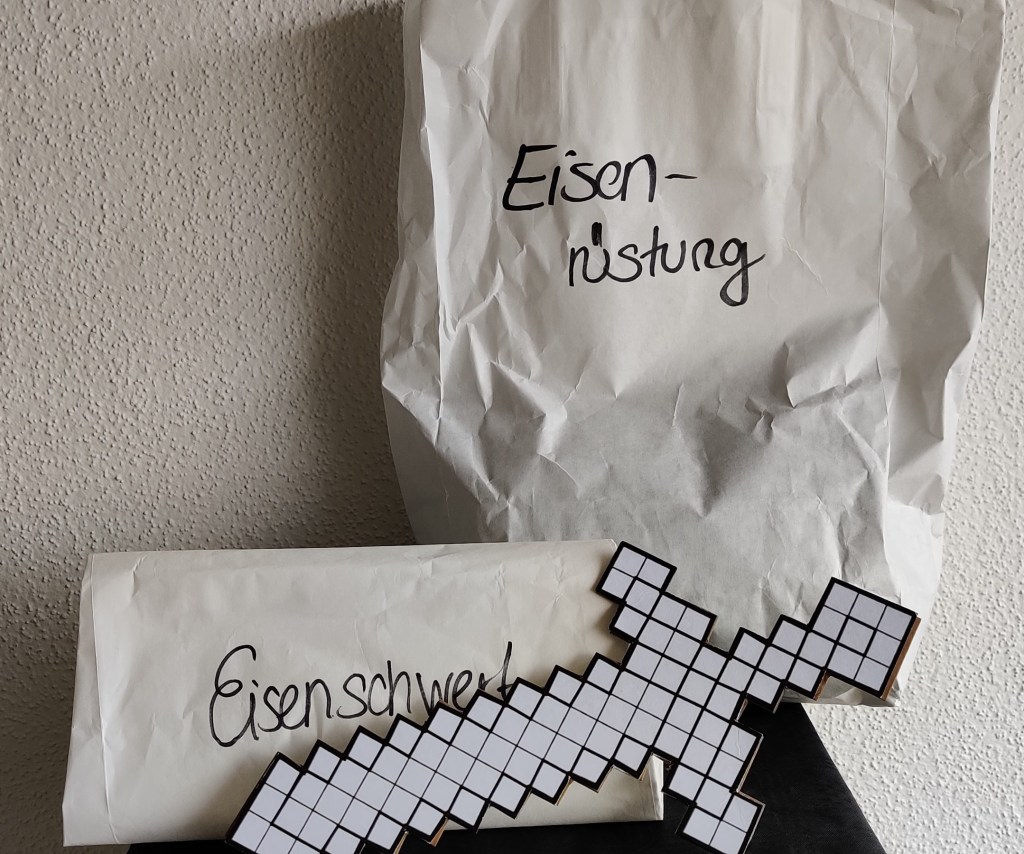 Aus dem Karneval-Store habe ich ein Minecraft-Set aus Schwert und Hacke besorgt. Für das Rezeptebuch habe ich ein Pocketalbum von DM besorgt, das Titelbild ersetzt und die Rezepte auf das Fotoformat 10 x 15 cm angepasst. Das Rezeptebuch gibts hier als PDF-Dokument zum Download. Zudem habe ich für jeden Abenteurer ein Schwert aus Pappe zurechtgeschnitten. In weißen Papiertüten waren die Materialien verstaut, die an der jeweligen Station gecraftet wurden.