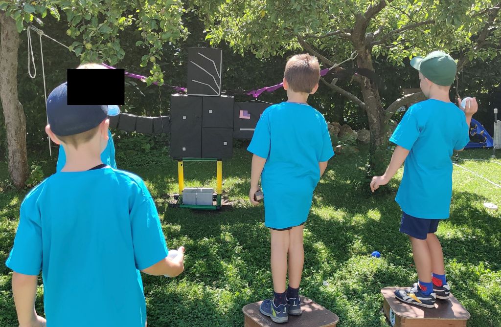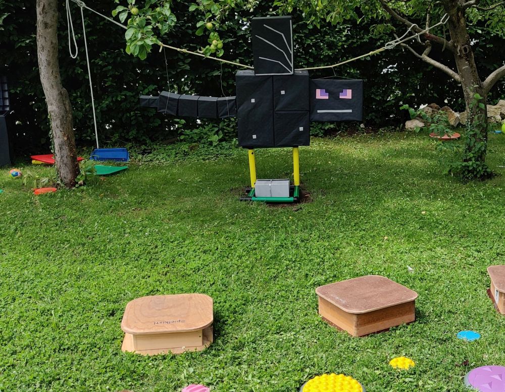 Im Planschbecken habe ich genug Wasserbomben bereit gelegt, mit denen der Enderdrache abgeworfen werden musste. Die Kinder stellten sich in der Reihe an, holten sich eine Wasserbombe und balancierten über die Inselsteine vor den Drachen und bewarfen ihn. Die Schatztruhe lag unter dem Drachen.