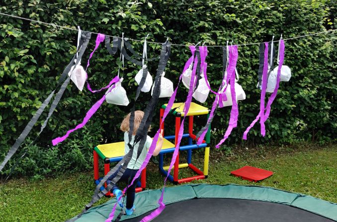 Hier rächt sich, dass ich die Feuerbälle der Blazes geworfen habe und leider kein einziges Foto gemacht habe. Ich habe auf der Garageneinfahrt drei Hoola-Hupp-Reifen plaziert, an denen gelbe und rote Luftballons mit kurzen und langen Schnüren angebunden waren. Die bewegten sich im Wind und waren das Hindernis für den Lauf. Die Blazes waren vor der Garage plaziert und waren vom Stil her wie die Enderman und Creeper nur halt in gelb. An ihnen befand sich gelbes Krepppapier, dass die Kinder abreißen mussten. Ich habe mit gelben Schaumstoffbällen nach den Kindern geworfen.