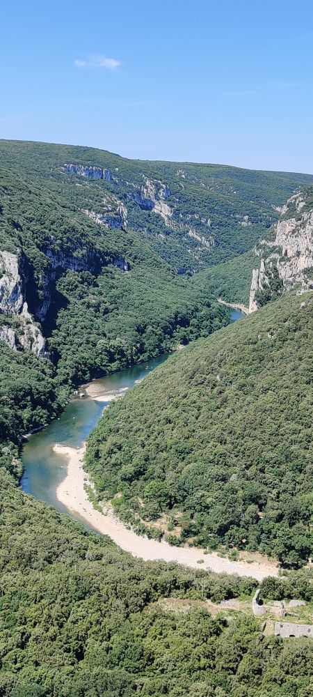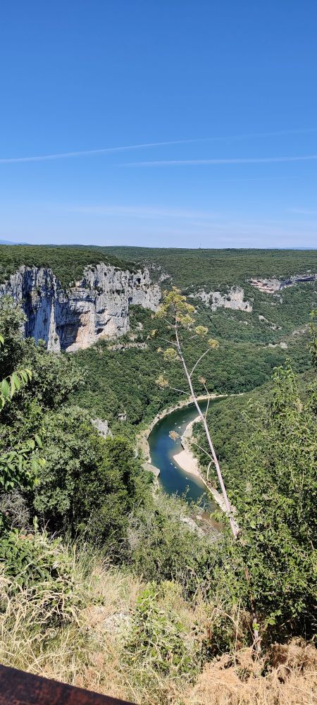 Unser erster Ausflug führt in die Region Ardèche, die ihren Namen dem gleichnamigen Fluss verdankt. Die Ardèche ist ein Wander- und Kanu-Hotspot. Unser Ziel war es, die 30 km lange Touristenstraße (route touristique, elf Aussichtspunkte) von Saint-Martin-d’Ardèche bis zur Pont d’Arc zu fahren und die Kinder mit Steine werfen zu belohnen 🙂