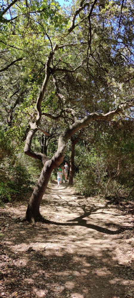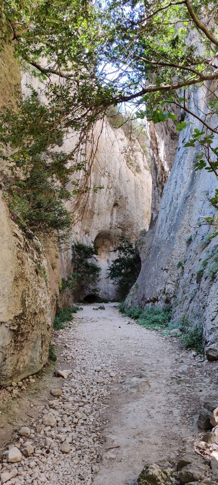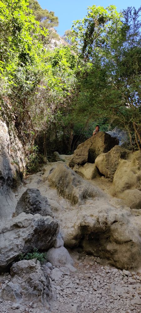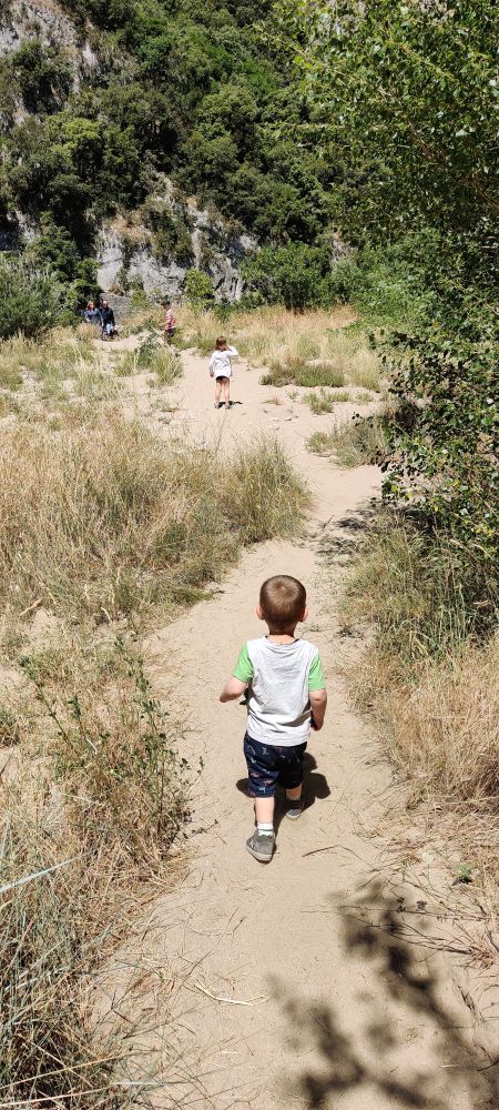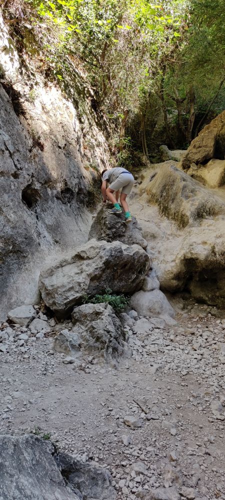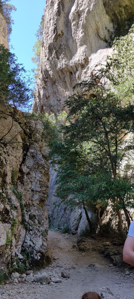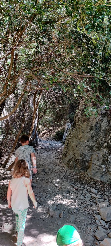 Ein großer Wanderparkplatz ist der Ausgangspunkt für mehrere Wanderwege. Der Weg zur Schlucht (nicht kinderwagentauglich) startet hinten am Parkplatz und führt zunächst durch einen Kiefernwald und an einem Olivenhain vorbei, bis man am Eingang der Schlucht angekommen ist. Rund 40m hoch ragen die Wände in den Himmel und die engste Stelle ist ca. 1 m breit. Der Weg ist anfangs leicht wird aber dann zunehmend schwieriger, da man über Steine und Felsstufen klettern muss. Wir sind soweit gegangen, wie es mit den Kids möglich war. Auch wenn wir nicht die ganze Schlucht durchwandert haben, hat sie uns doch nachhaltig beeindruckt!