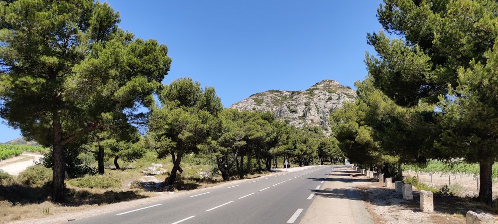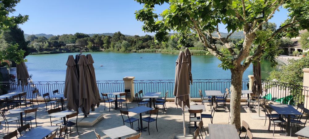 Am nächsten Tag ging die Fahrt entlang des Neuburger Sees zurück auf die Autobahn. Immer wieder konnten wir einen Blick auf den Seen und die Bergkulisse ergattern. In Frankreich angekommen fuhren wir via Annecy Richtung Grenoble und Valence am Rande verschiedener Bergmassive (Bauges-Massiv, Chartreuse-Massiv) entlang. Hinter Valence verläuft die Autobahn parallel zur Rhône und später zur Durance. Wir fuhren bis zur Ausfahrt Senas / Mallemort. Von dort aus sind es noch ca. 15 min Autofahrt u. a. durch eine lange Platanen-Allee zum Resort.