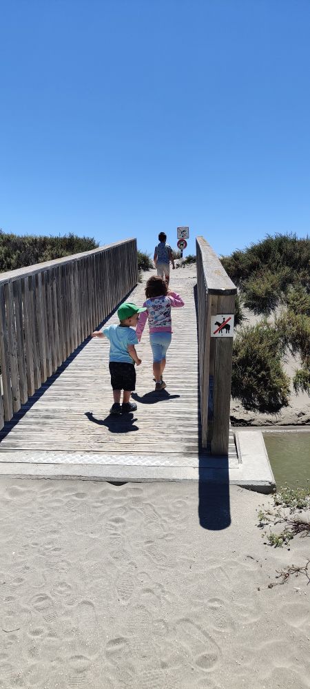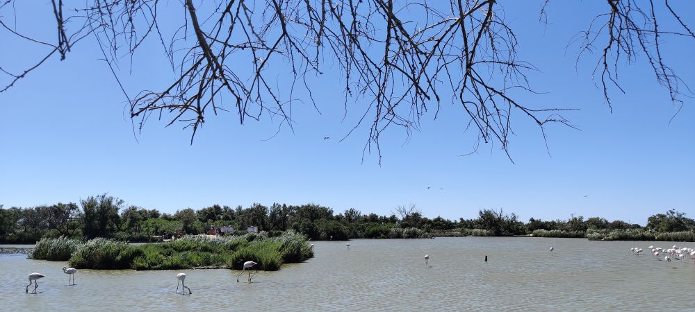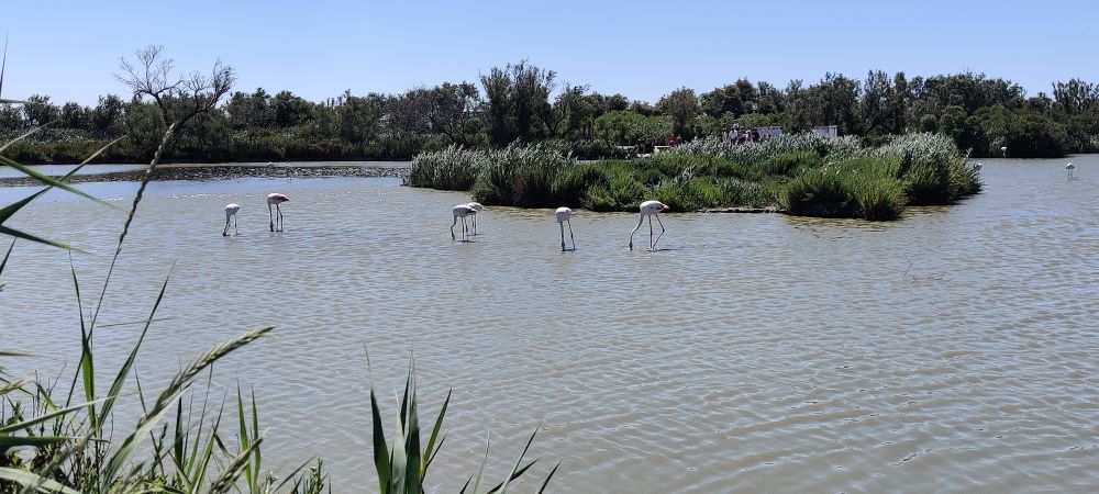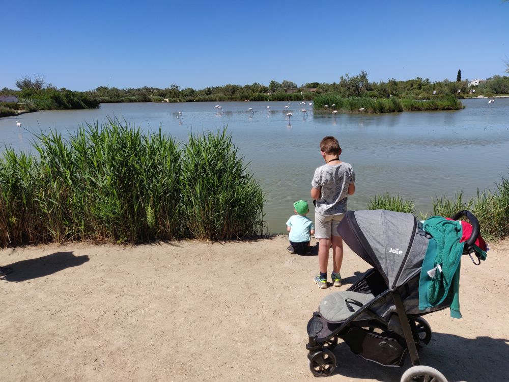 Auf nach Süden in die Camargue! Auf der Autobahn ging es via Salon-de-Provence nach Arles und auf die Staatsstraße Richtung Saintes Maries de la Mer. Unser erster Stop war der Vogelpark Pont de Gau. Hier gibt es neben zahlreichen Vogelarten auch die rosa Flamingos zu sehen. Die Flamingos stehen nicht nur im Wasser, sondern fliegen auch über uns hinweg. Einen Start oder Landung dieser Tiere zu sehen ist einzigartig! Wir umrundeten gemütlich das Becken Mareis A. Lamouroux (Weg ist kinderwagentauglich) und aßen eine Kleinigkeit beim Imbissstand.