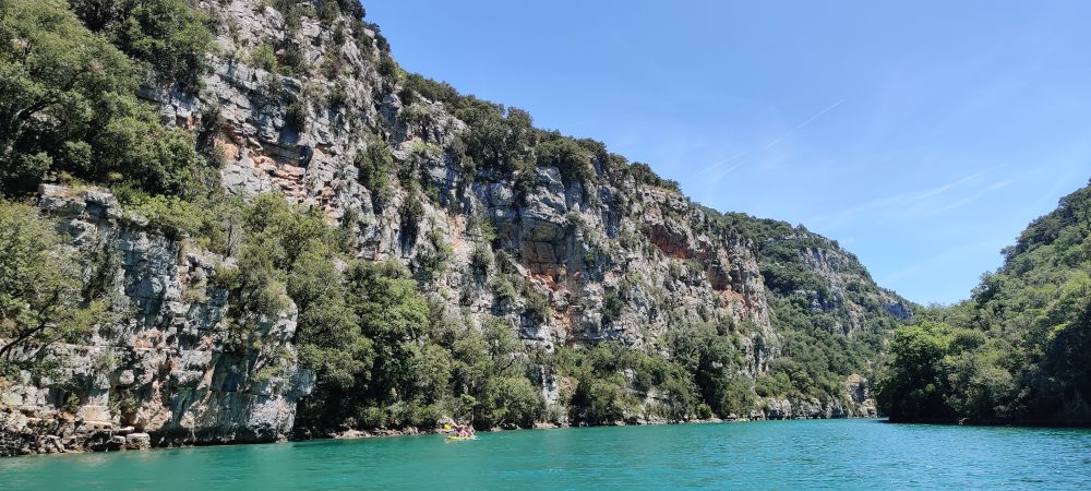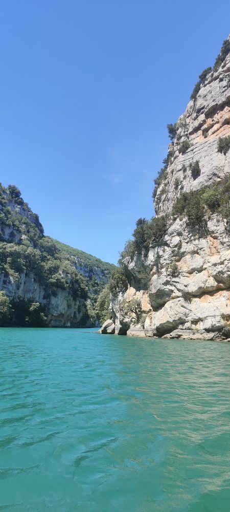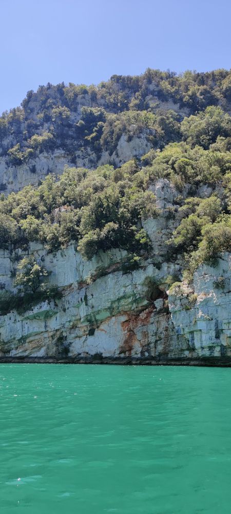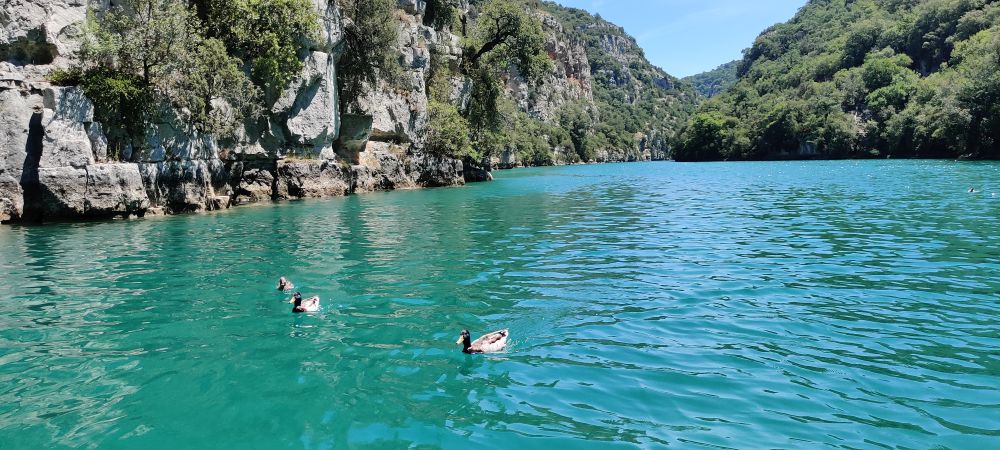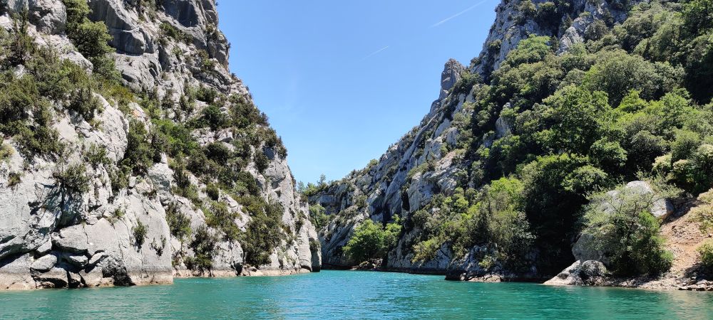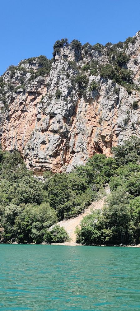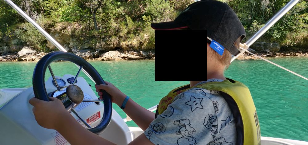 Unsere Tour ging nach Quinson (90 km, 1:30h) zur unteren Verdon-Schlucht. Im Vorfeld haben wir uns ein E-Boot reserviert bei Location Nautic am Montmeyan Plage. Für zwei Stunden konnte jeder von uns nach einer kurzen Einführung Kapitän oder Kapitänin sein. Die Boote fahren sehr gemütlich, so dass selbst unser K3 hinter dem Steuer war. Man teilt sich die Schlucht mit KanufahrerInnen und anderen E-Booten. Die Menge war aber überschaubar (ich will nicht wissen, wie das in der Hauptsaison ist).